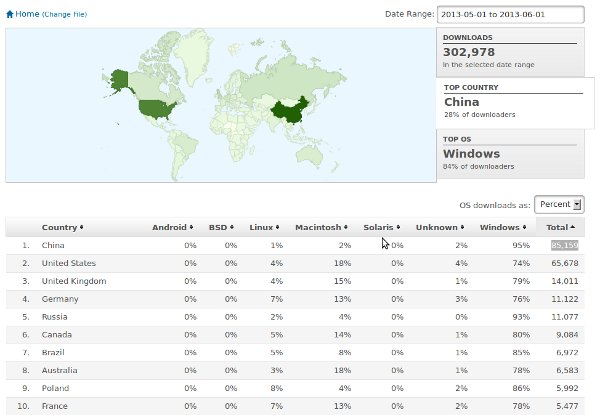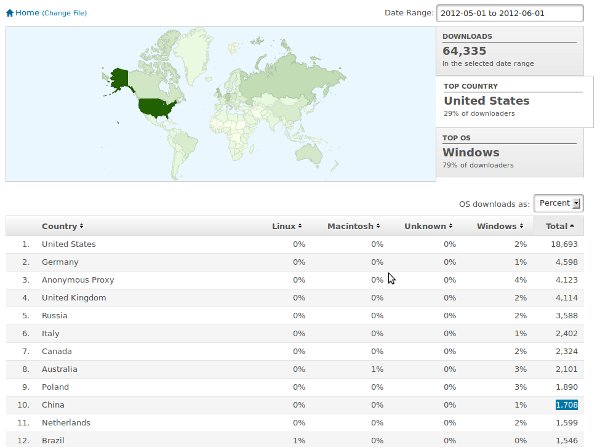 In May 2012 US is leading download charts with 18k downloads, against closest opponent Germany with 4.5k downloads per month. Then we can see other countries including UK, Russia and China. China is number 10 with 1.7k downloads.