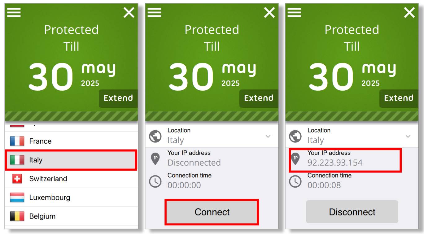 3. Connect to the selected server by tapping or clicking the “Connect” button.