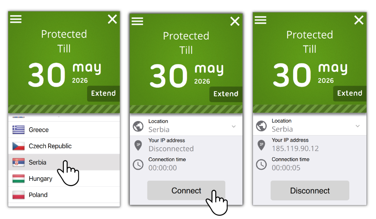 So, if you’re interested to obtain a Serbian IP Address, you can simply open Seed4.Me VPN App on your device, choose Serbia from the location list and click the Connect button as shown in these screenshots: